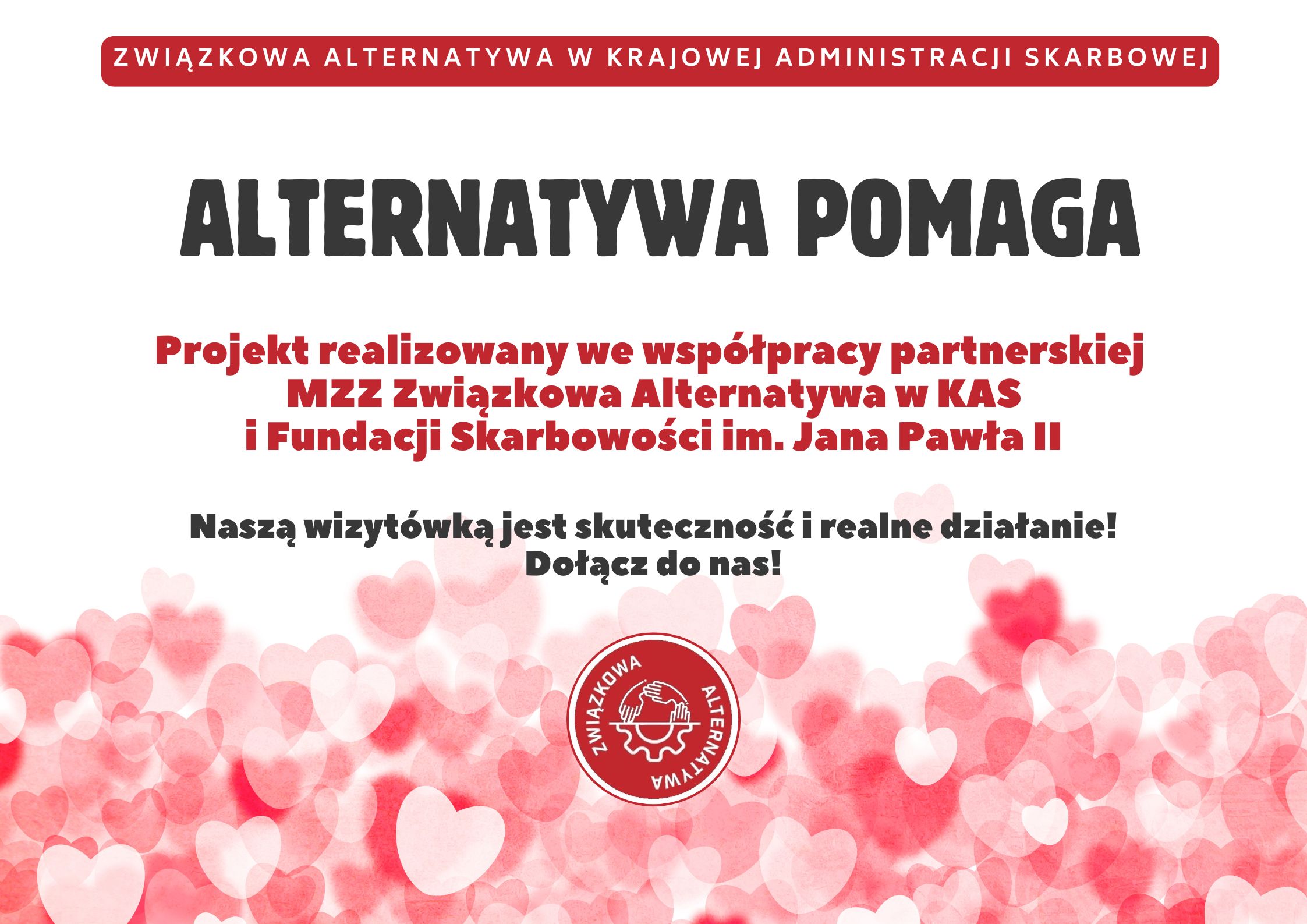 Związek Zawodowy ZWIĄZKOWA ALTERNATYWA w KAS we współpracy Partnerskiej z Fundacją Skarbowości im. Jana Pawła II rusza z Kampanią Dobroczynną pod nazwą ALTERNATYWA POMAGA