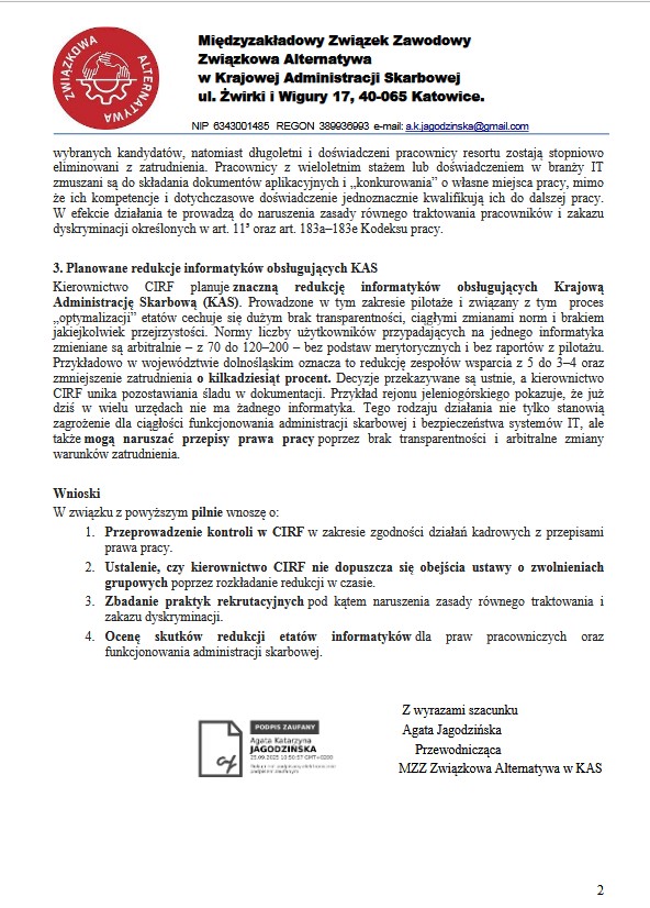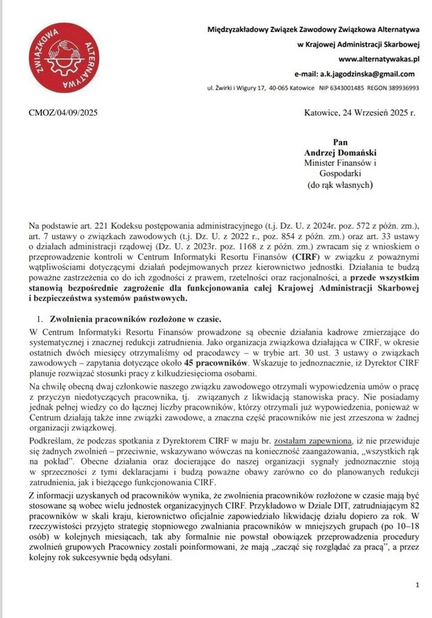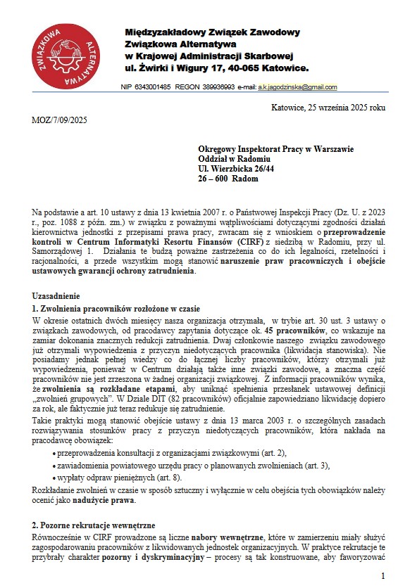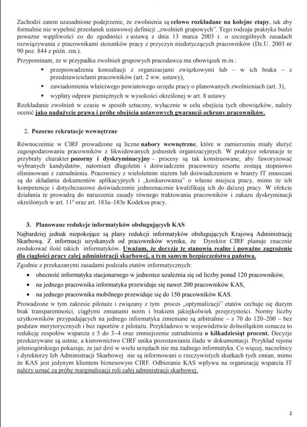 Składamy kolejne zawiadomienia ws. zwolnień w CIRF