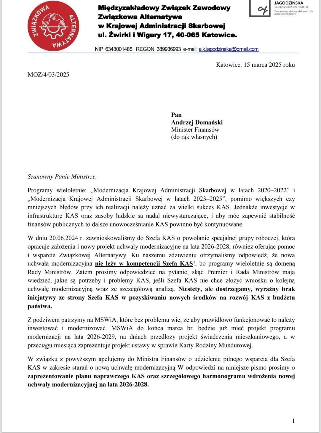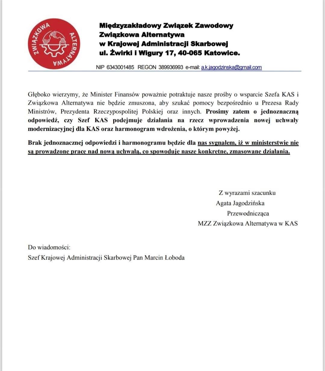 Zarząd MZZ Związkowa Alternatywa w KAS