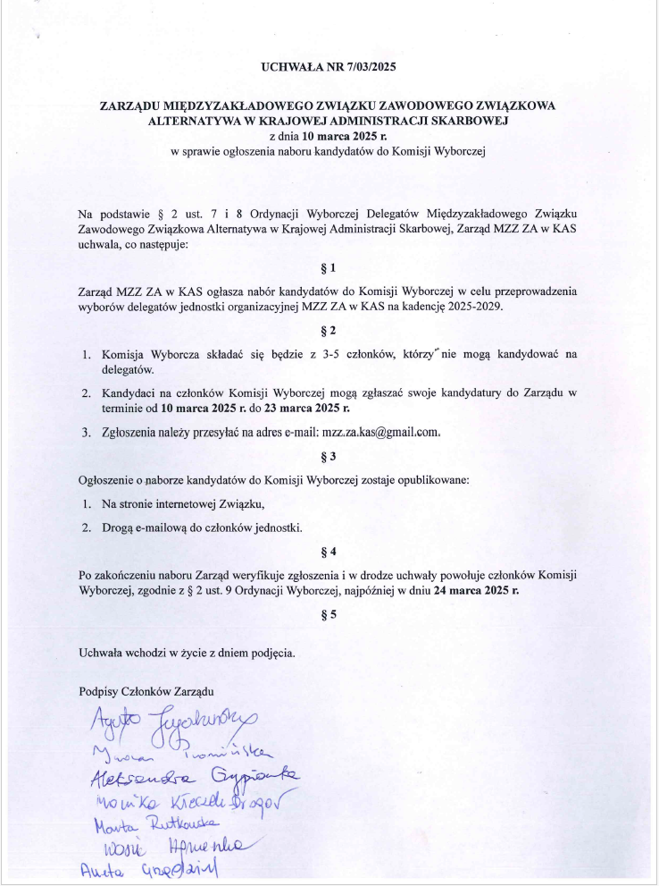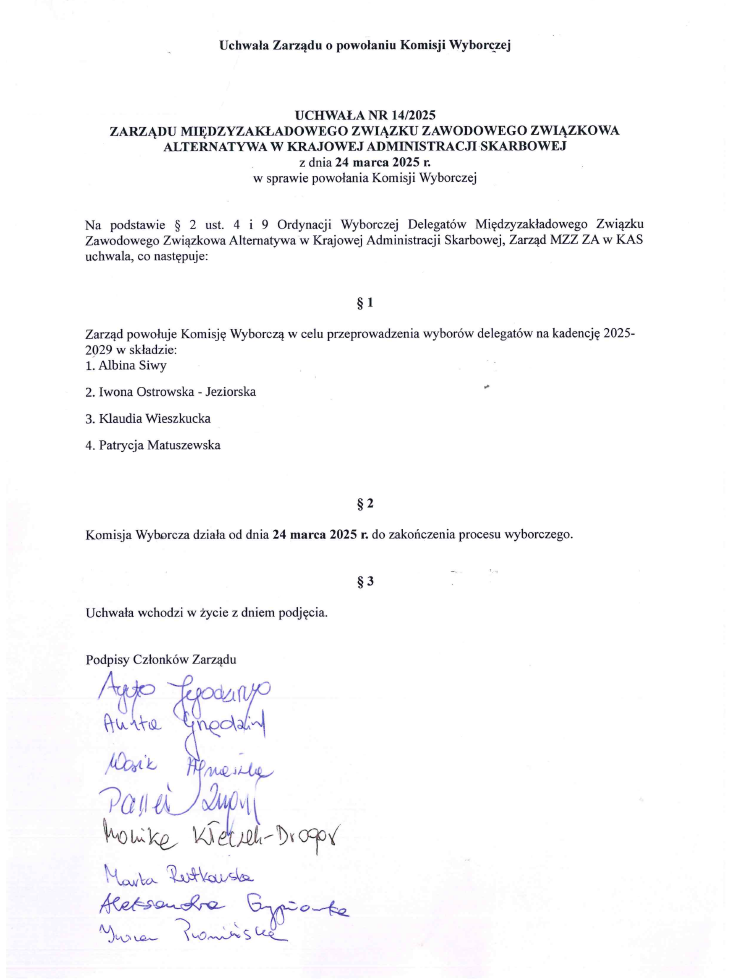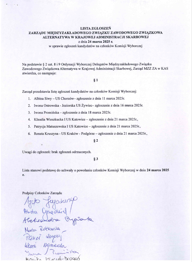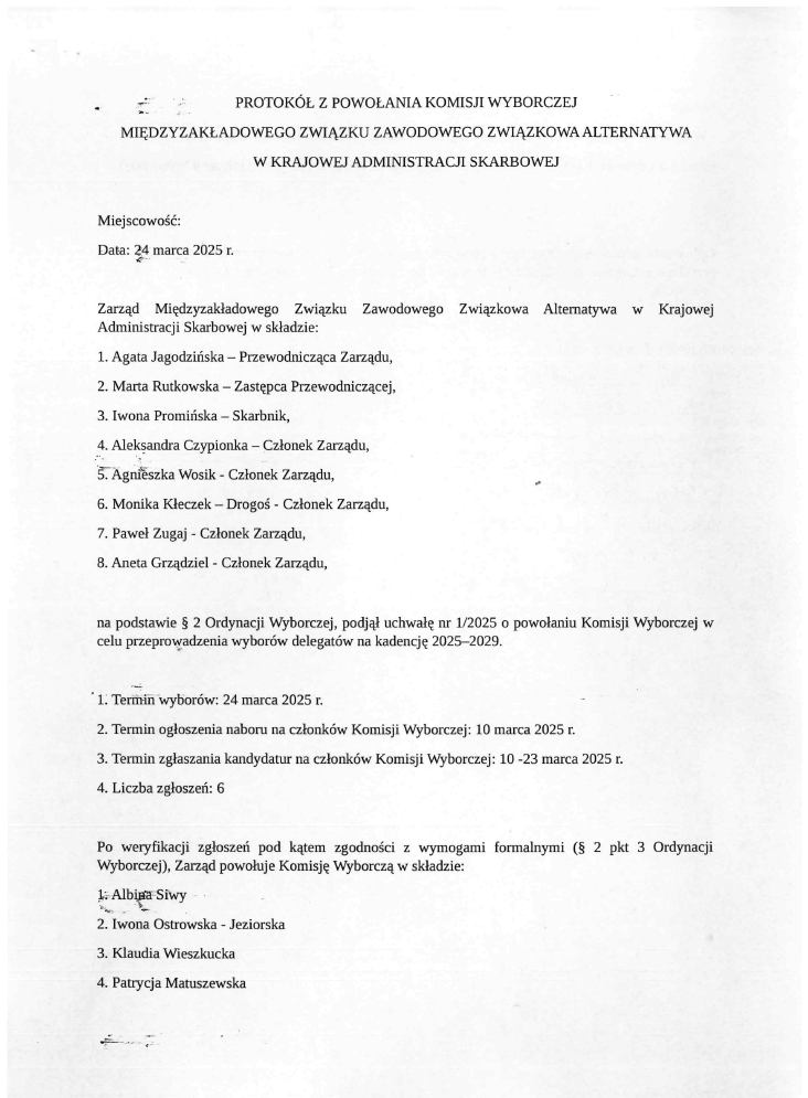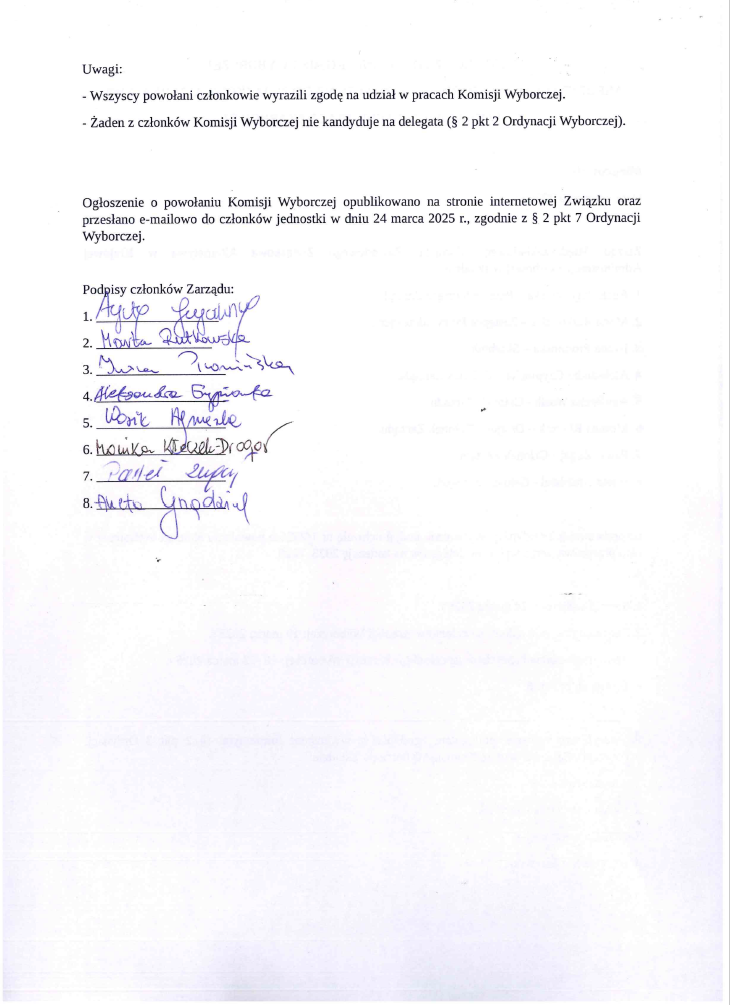 informujemy, że w dniu 24.03.2025 r. została powołana Komisja Wyborcza do przeprowadzenia wyborów delegatów na kadencję 2025 – 2029 w składzie: